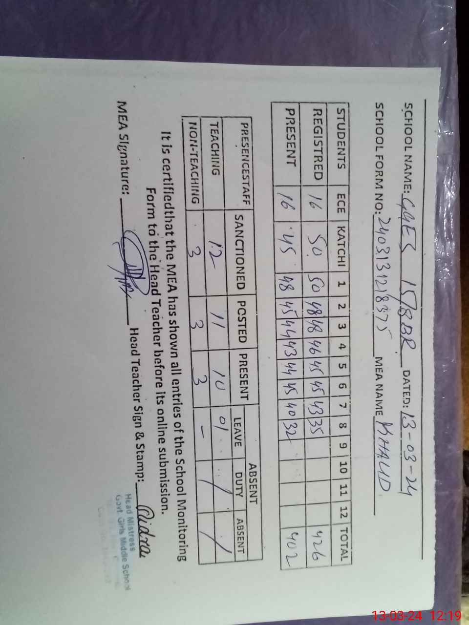 | Attendance Register | Head Teacher | MEA with School | Visit Proof |