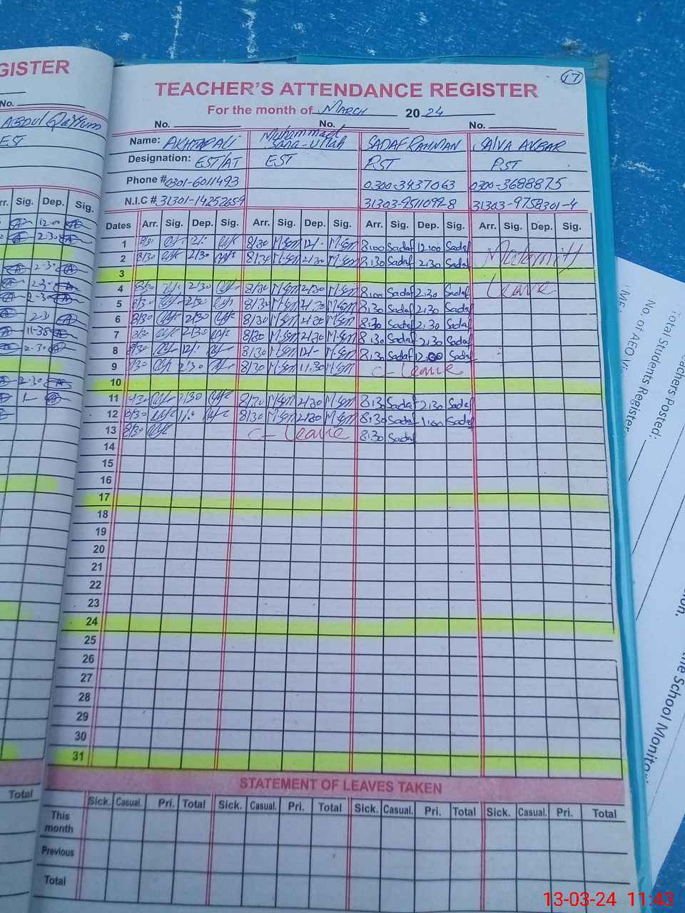 | CNIC | Full Name | Designation | R/C | Absence during last cal. month |