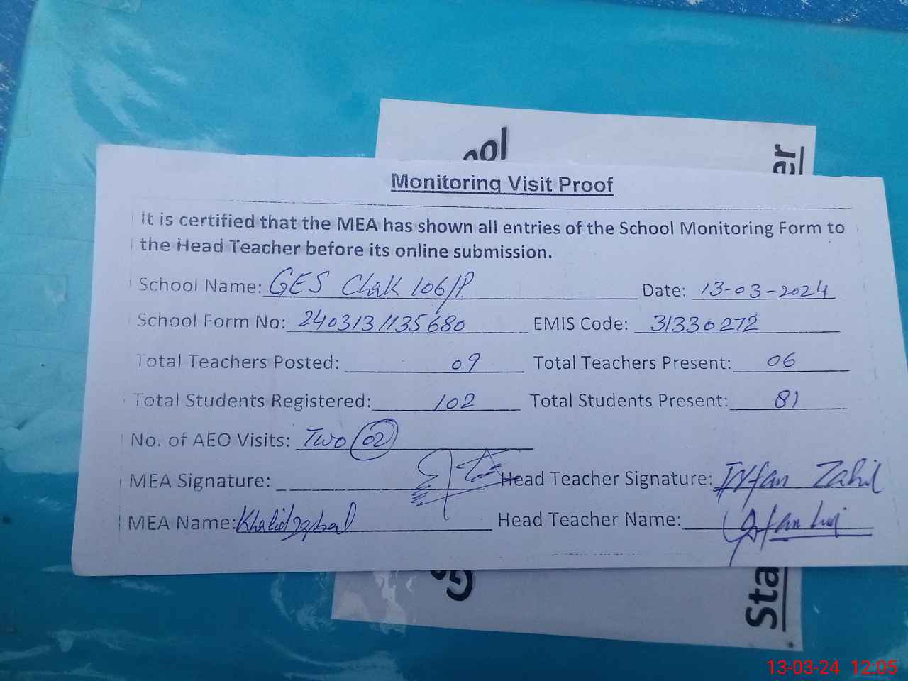 | Attendance Register | Head Teacher | MEA with School | Visit Proof |