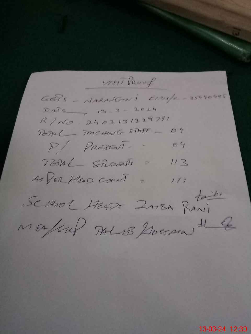 | Attendance Register | Head Teacher | MEA with School | Visit Proof |