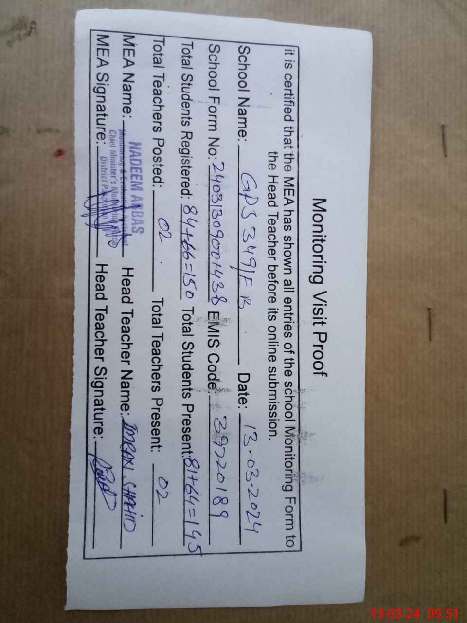 | Attendance Register | Head Teacher | MEA with School | Visit Proof |