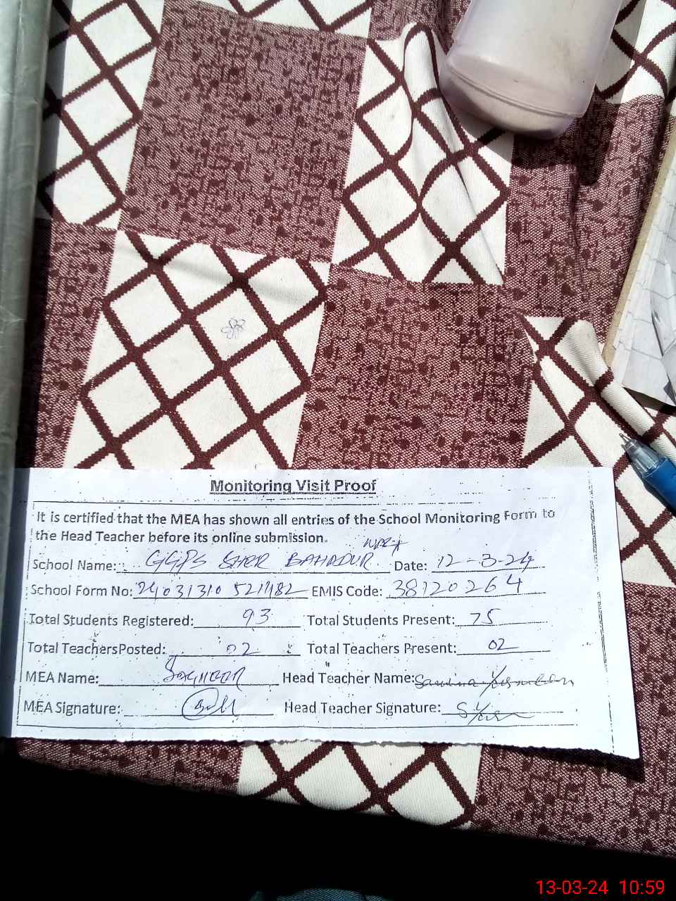 | Name: Me**** In**** Designation: (School Headmaster's/Headmistress's) PTC/JV Phone/Cell Number: 03**** |
