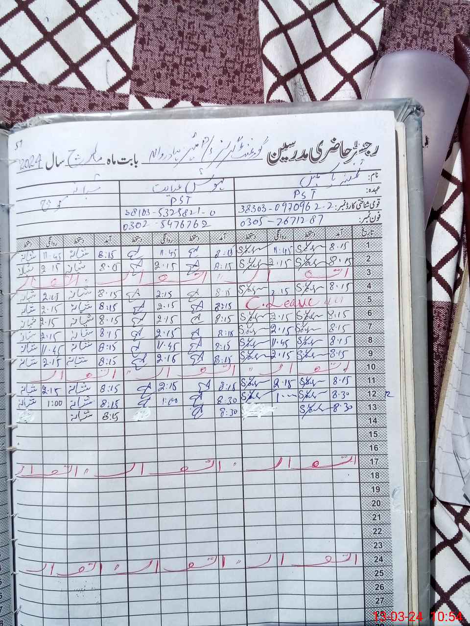 | CNIC | Full Name | Designation | R/C | Absence During Last Calender Month |
