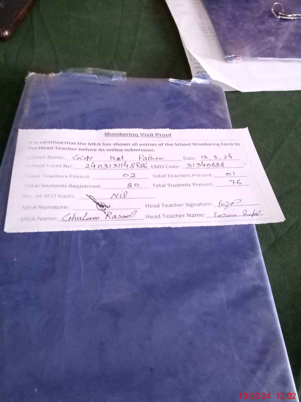 | Attendance Register | Head Teacher | MEA with School | Visit Proof |