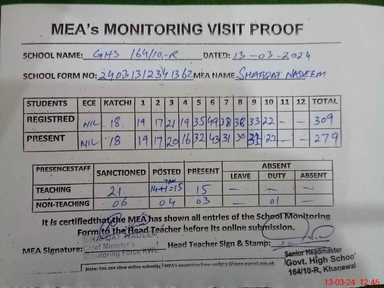 | EMIS Code: 36420012 | Name of School: GHS 164/10-R, KHANEWAL | |||