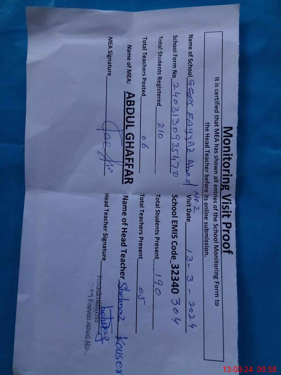 | Attendance Register | Head Teacher | MEA with School | Visit Proof |