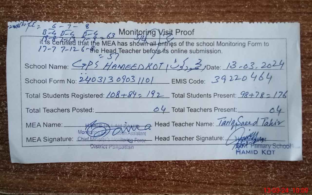 | EMIS Code: 39220464 | Name of School: GPS HAMEED KOT (MEHMOOD KOT) | |||