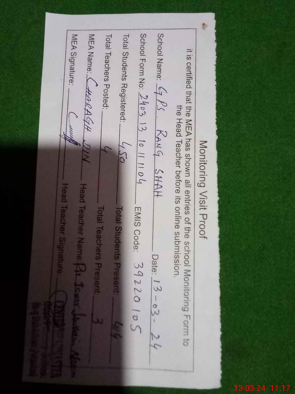 | Attendance Register | Head Teacher | MEA with School | Visit Proof |