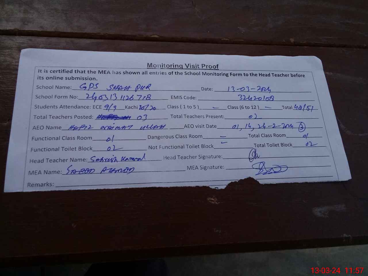 | Attendance Register | Head Teacher | MEA with School | Visit Proof |