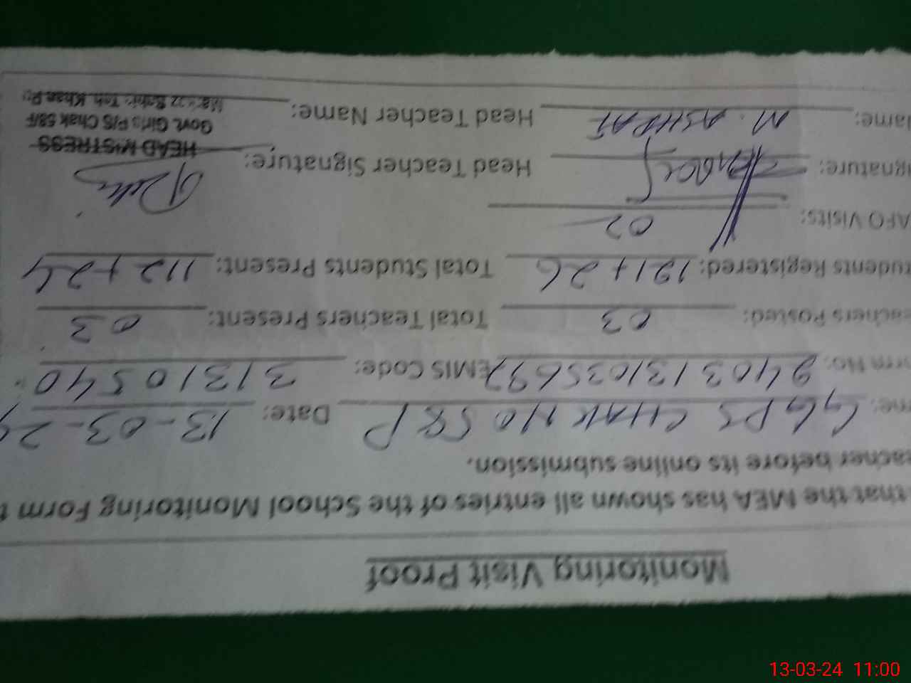 | Name: RA**** PA**** Designation: (School Headmaster's/Headmistress's) PST Phone/Cell Number: 03**** |