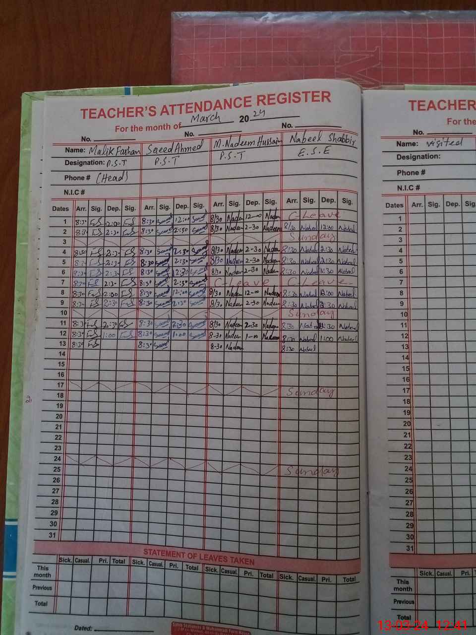 | CNIC | Full Name | Designation | R/C | Absence During Last Calender Month |