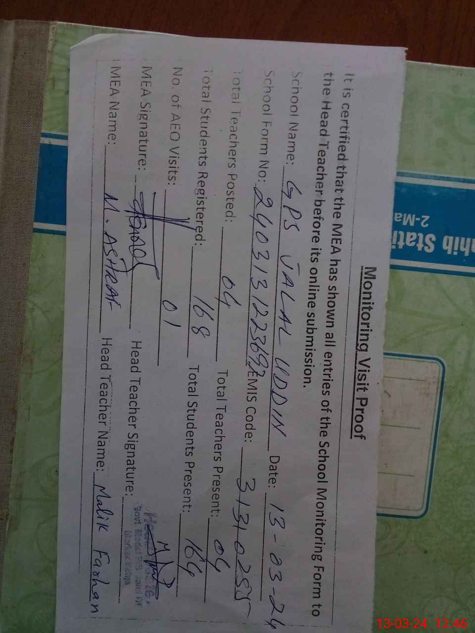 | Attendance Register | Head Teacher | MEA with School | Visit Proof |