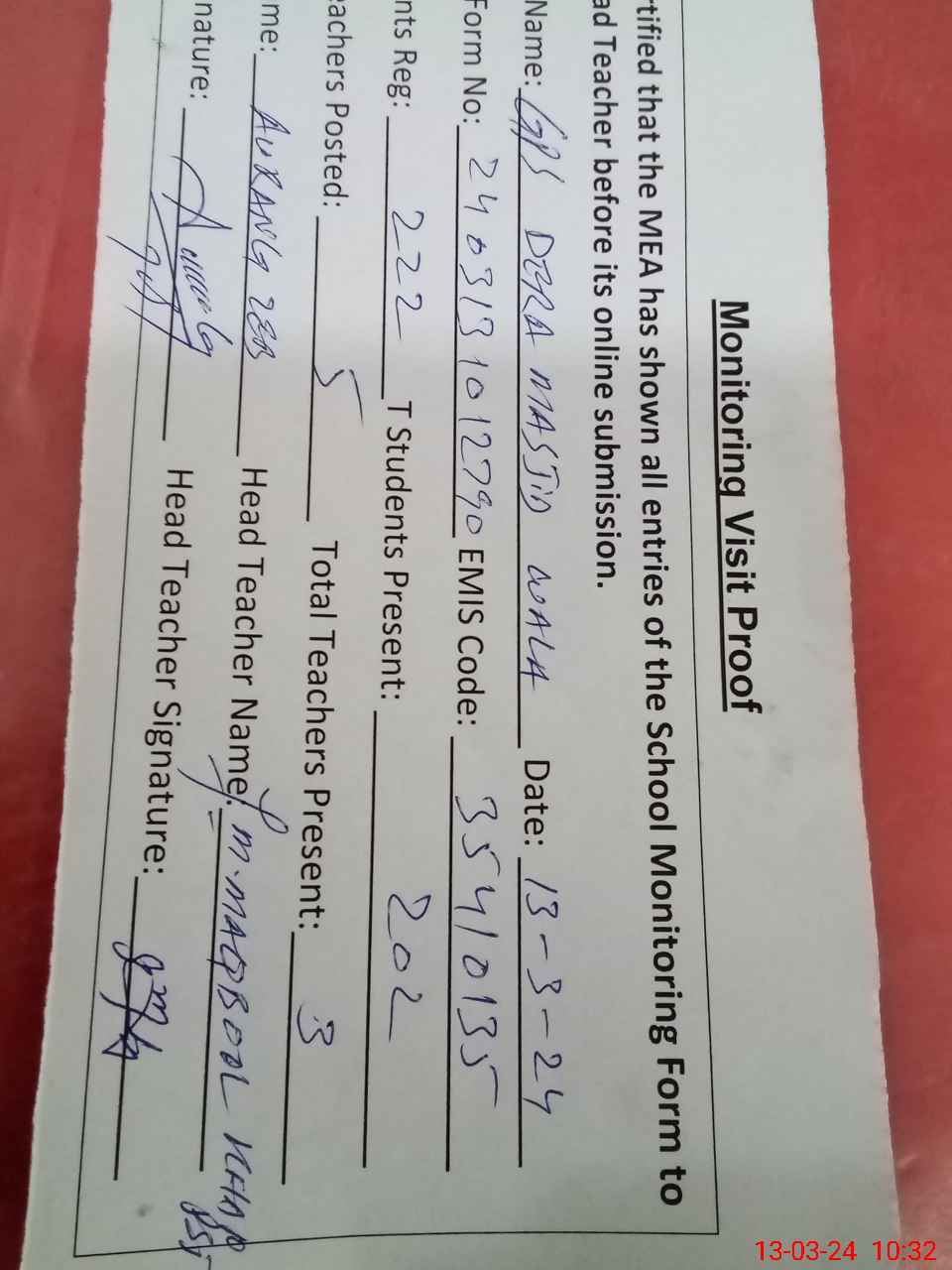 | Attendance Register | Head Teacher | MEA with School | Visit Proof |
