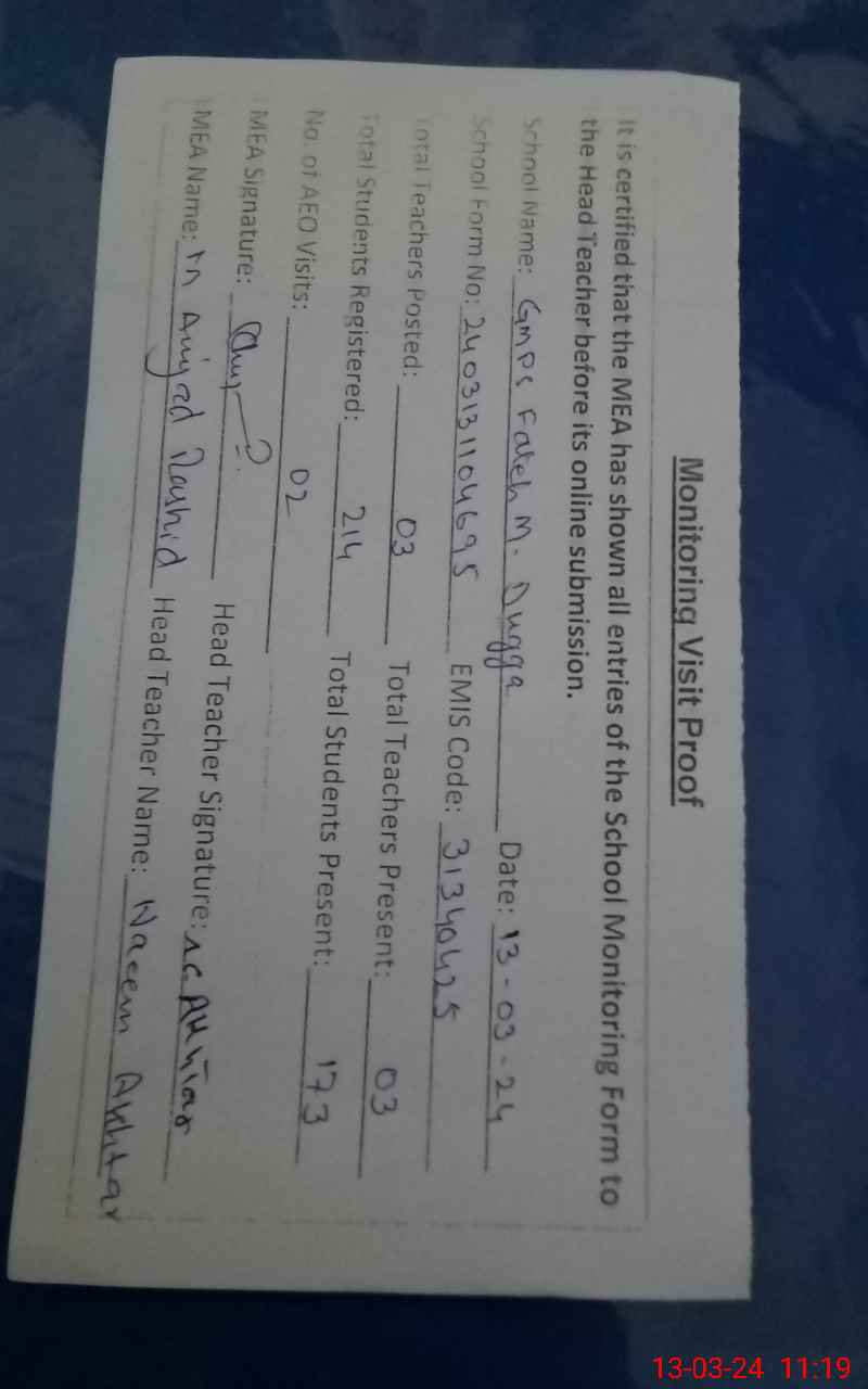 | EMIS Code: 31340425 | Name of School: GMPS FATEH MUHAMMAD DUGGA | |||