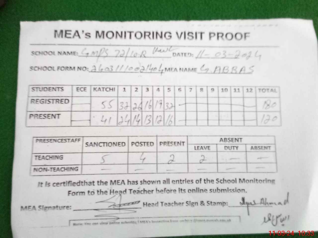 | Attendance Register | Head Teacher | MEA with School | Visit Proof |