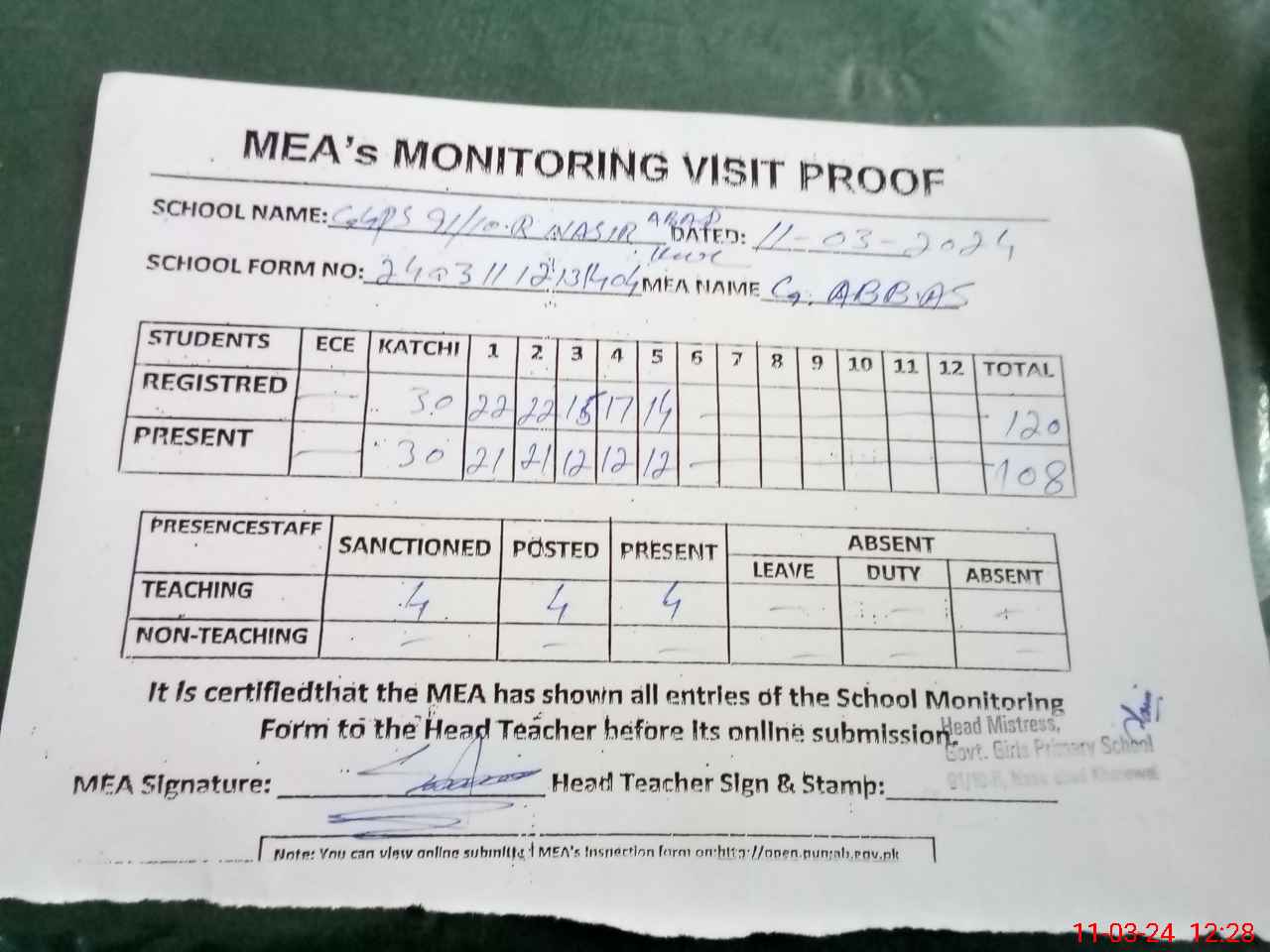 | Attendance Register | Head Teacher | MEA with School | Visit Proof |