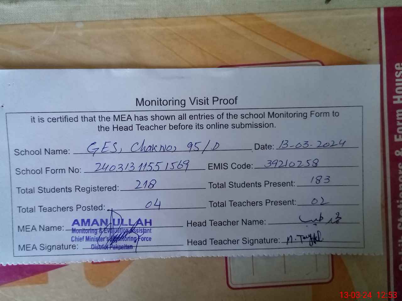 | Attendance Register | Head Teacher | MEA with School | Visit Proof |
