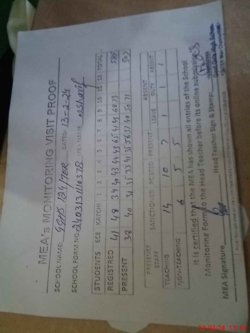| Attendance Register | Head Teacher | MEA with School | Visit Proof |