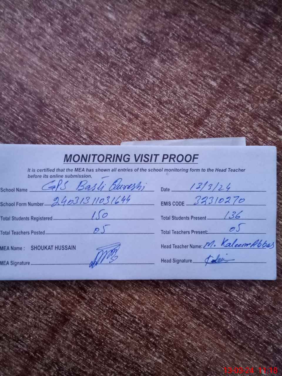 | Attendance Register | Head Teacher | MEA with School | Visit Proof |