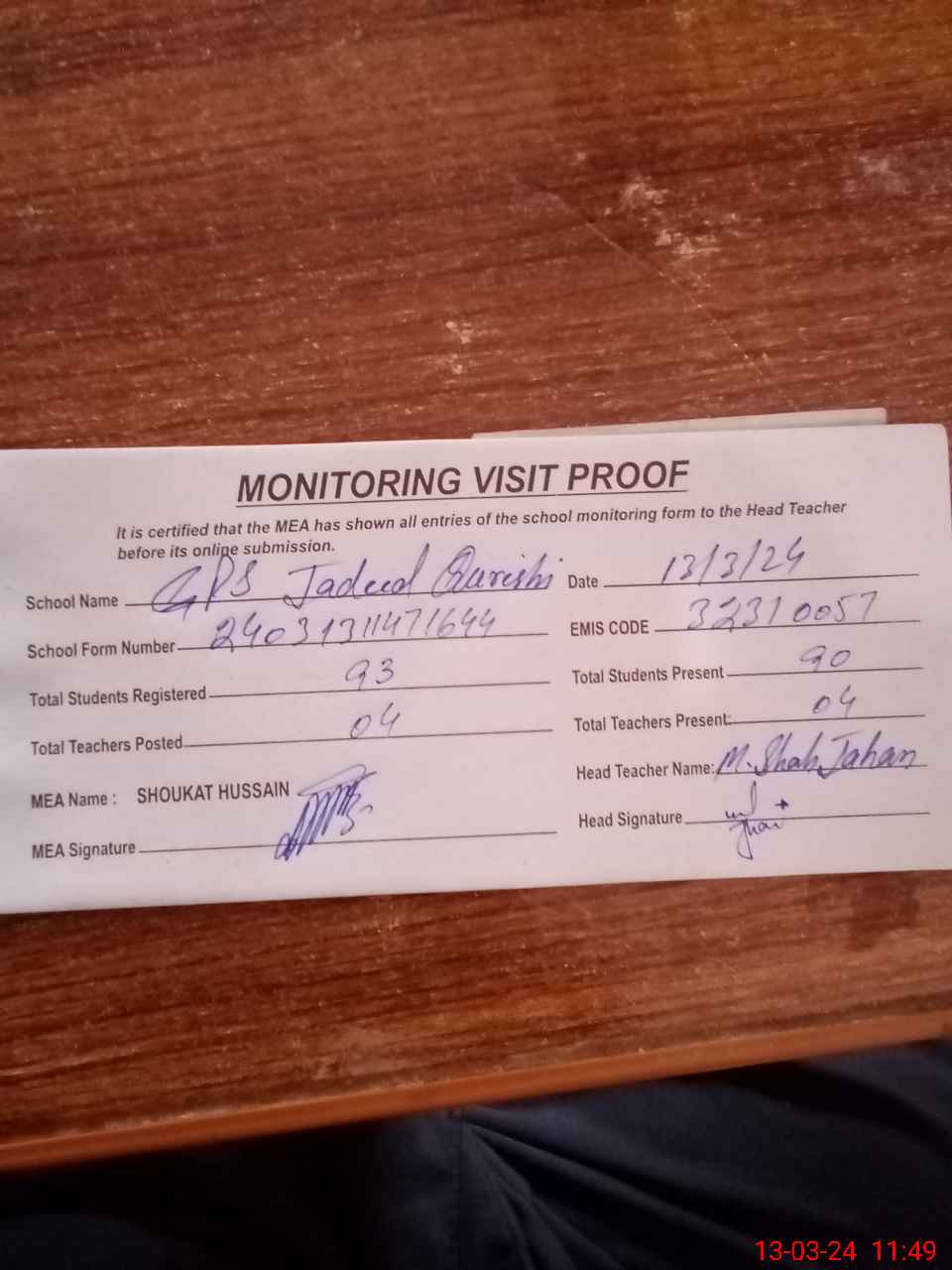 | Attendance Register | Head Teacher | MEA with School | Visit Proof |