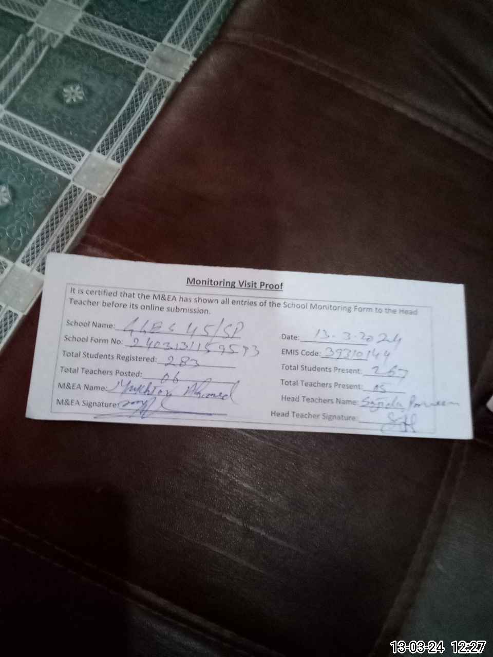 | Attendance Register | Head Teacher | MEA with School | Visit Proof |