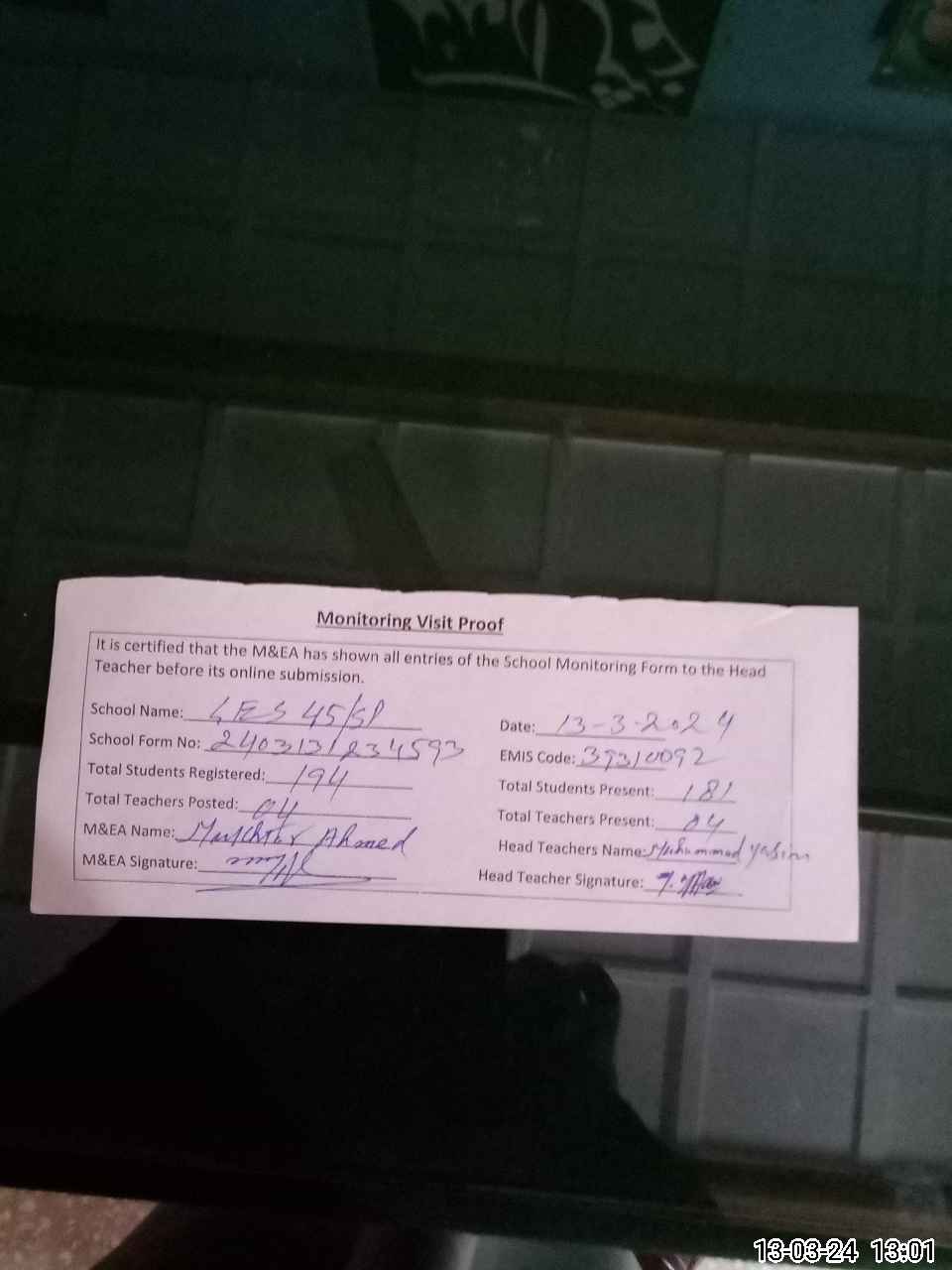 | Attendance Register | Head Teacher | MEA with School | Visit Proof |