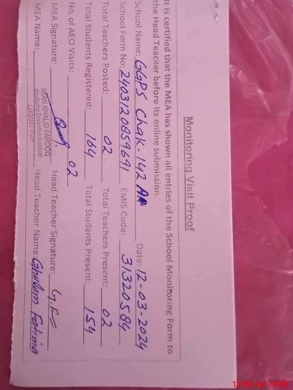 | EMIS Code: 31320584 | Name of School: GGPS CHAK NO 142 /A | |||