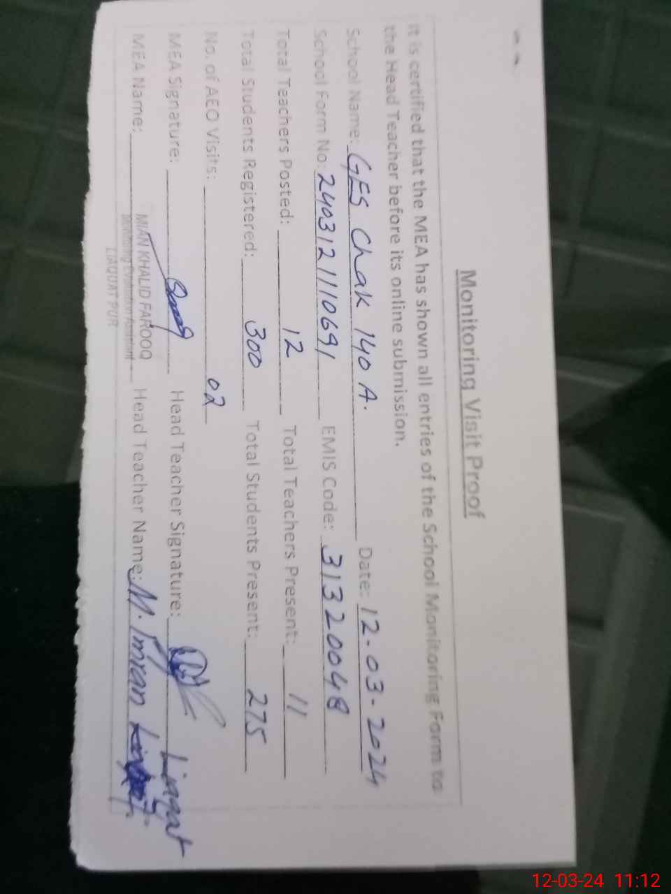 | EMIS Code: 31320048 | Name of School: GES CHAK NO.140-A | |||