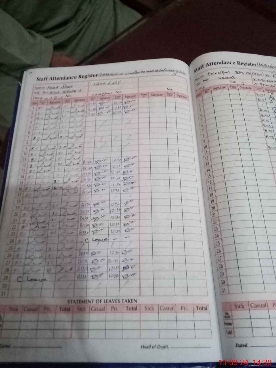 | CNIC | Full Name | Designation | R/C | Absence During Last Calender Month |