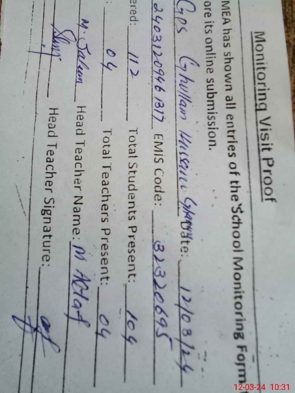| Attendance Register | Head Teacher | MEA with School | Visit Proof |