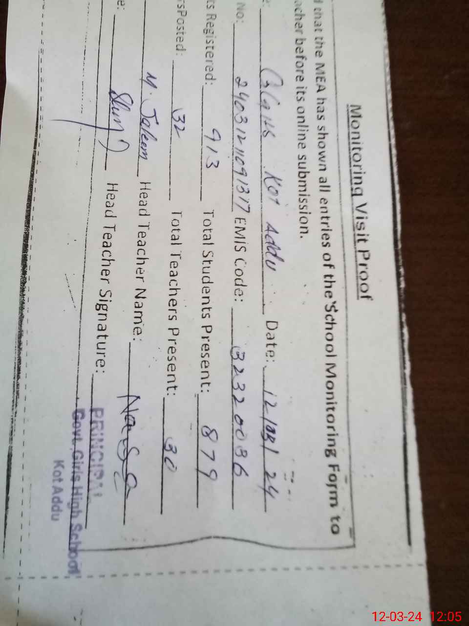 | EMIS Code: 32320036 | Name of School: GGHS KOT ADU | |||