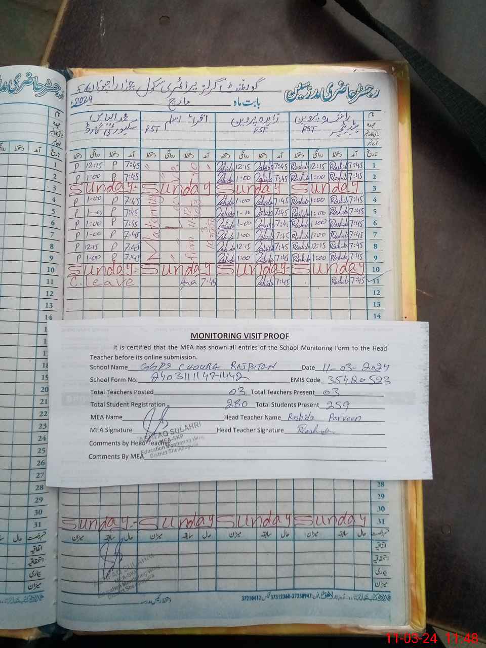 | Attendance Register | Head Teacher | MEA with School | Visit Proof |