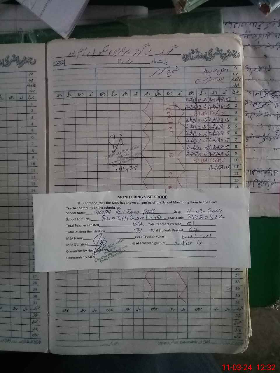| Attendance Register | Head Teacher | MEA with School | Visit Proof |