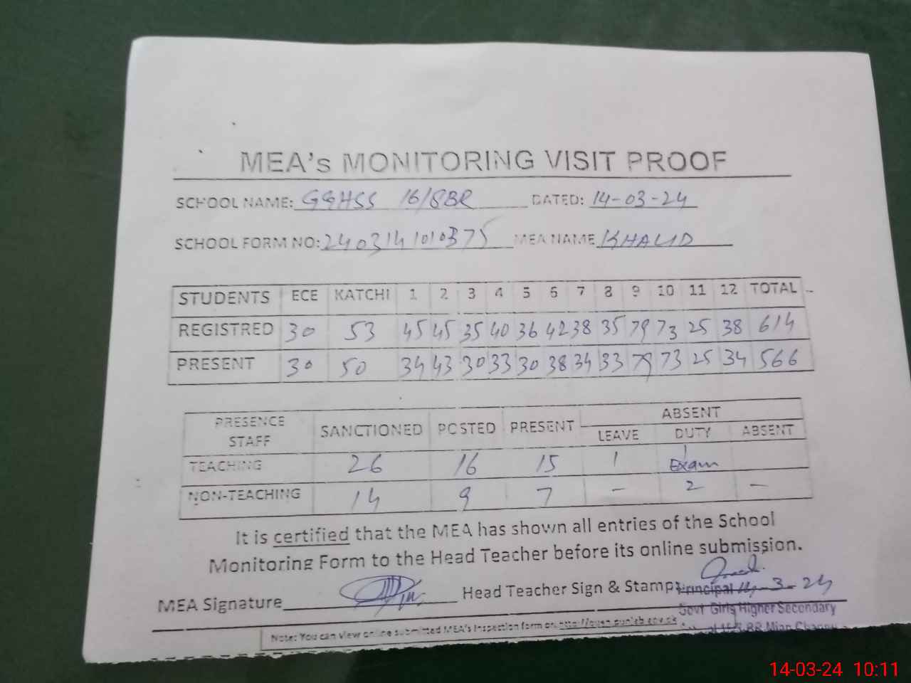 | Attendance Register | Head Teacher | MEA with School | Visit Proof |