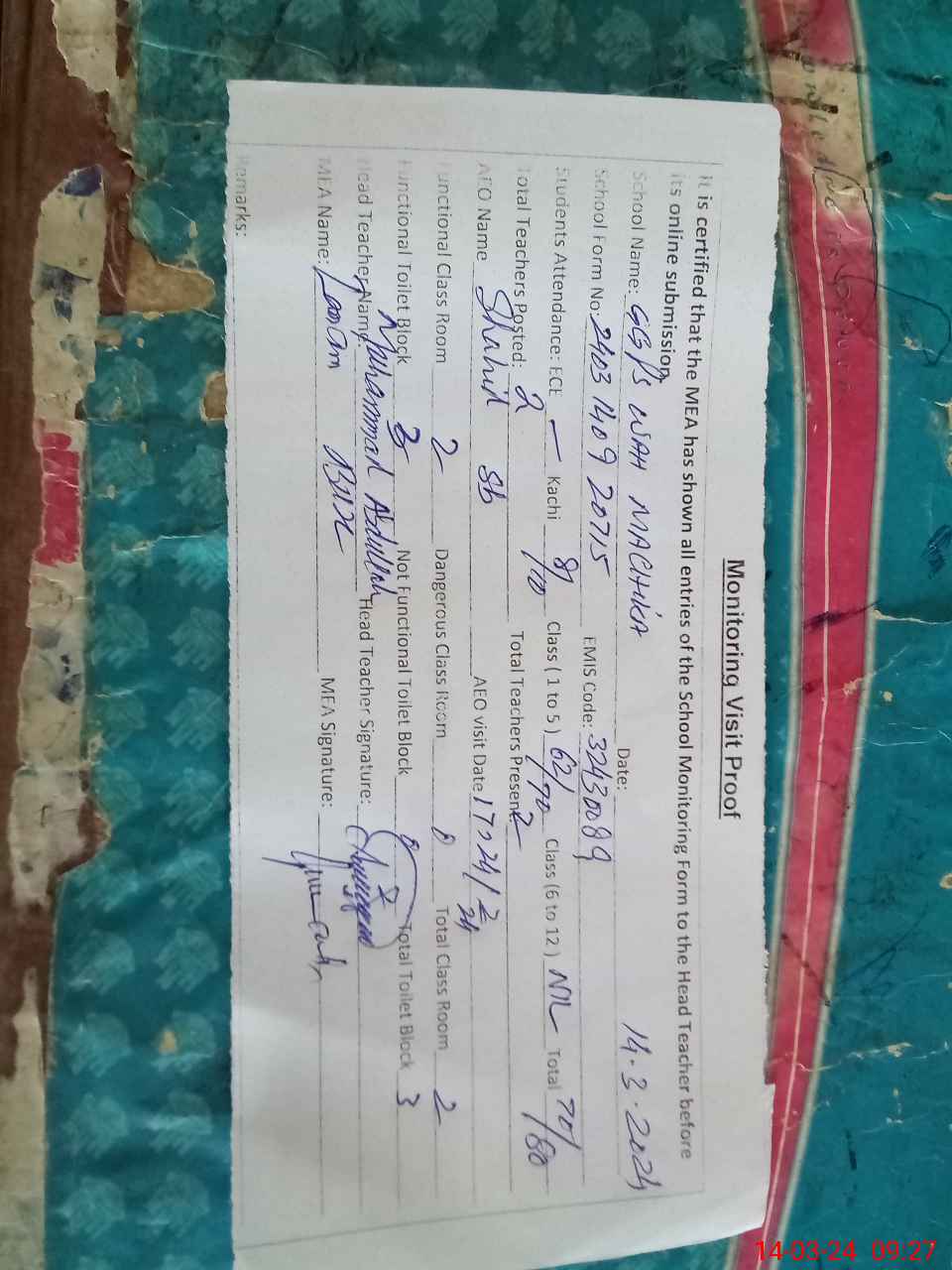 | Attendance Register | Head Teacher | MEA with School | Visit Proof |