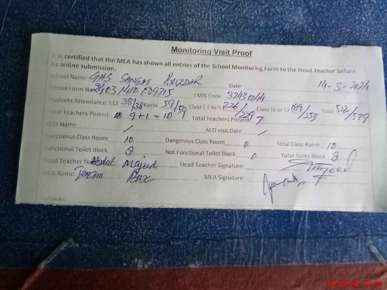 | EMIS Code: 32430044 | Name of School: GHS SANGAT BUZDAR | |||