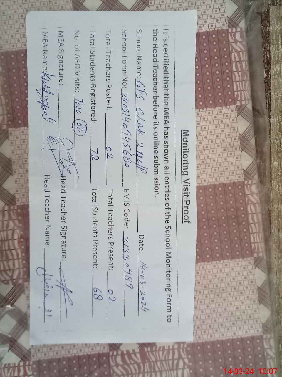 | Attendance Register | Head Teacher | MEA with School | Visit Proof |