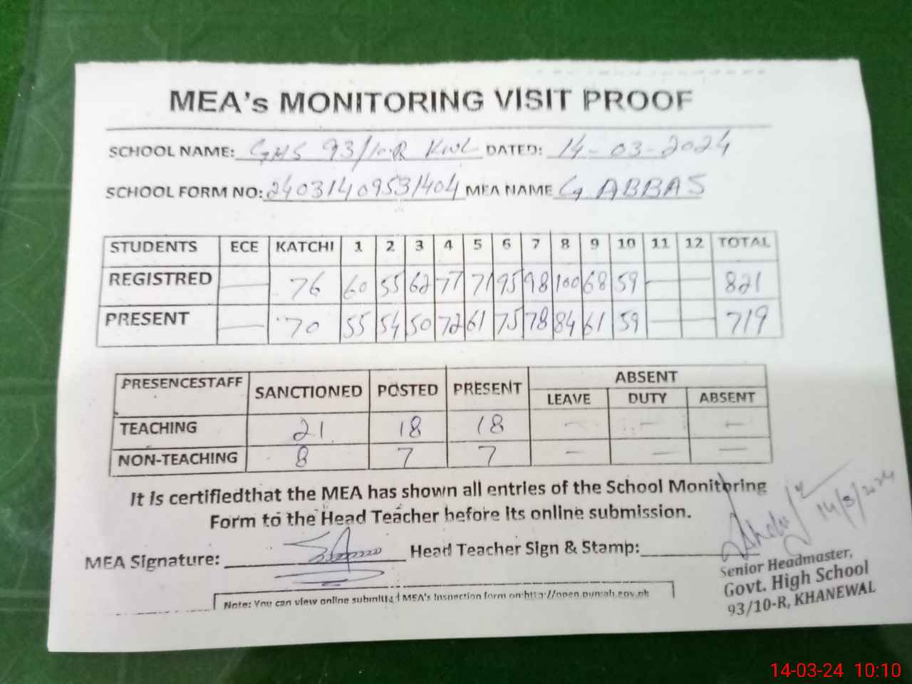 | Attendance Register | Head Teacher | MEA with School | Visit Proof |