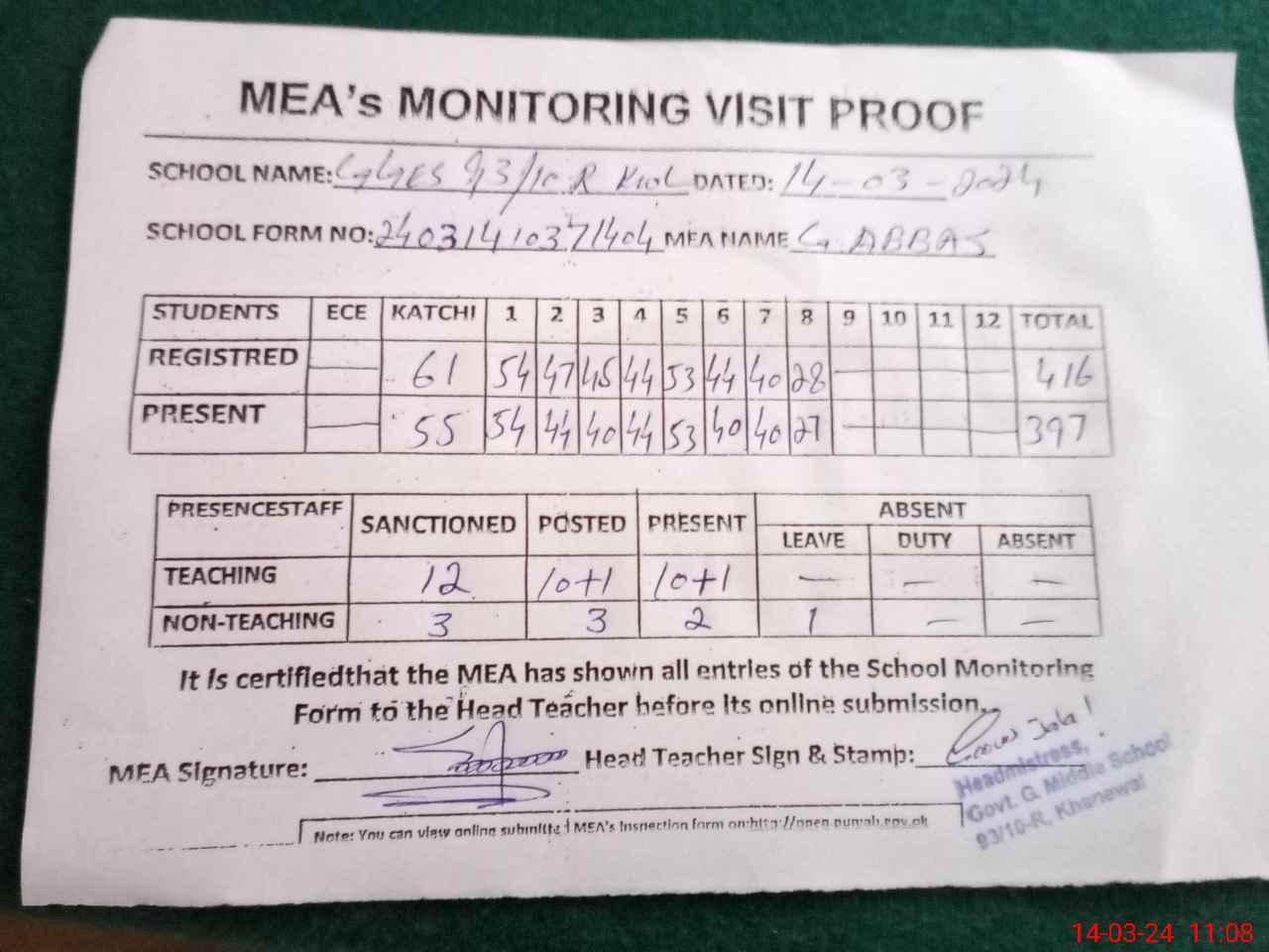 | Attendance Register | Head Teacher | MEA with School | Visit Proof |