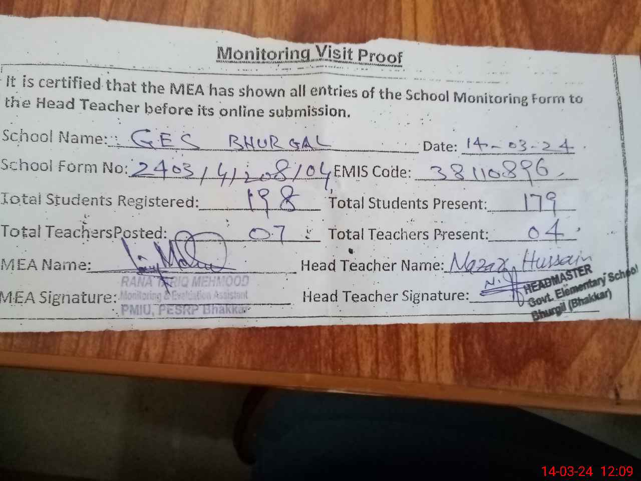 | Attendance Register | Head Teacher | MEA with School | Visit Proof |