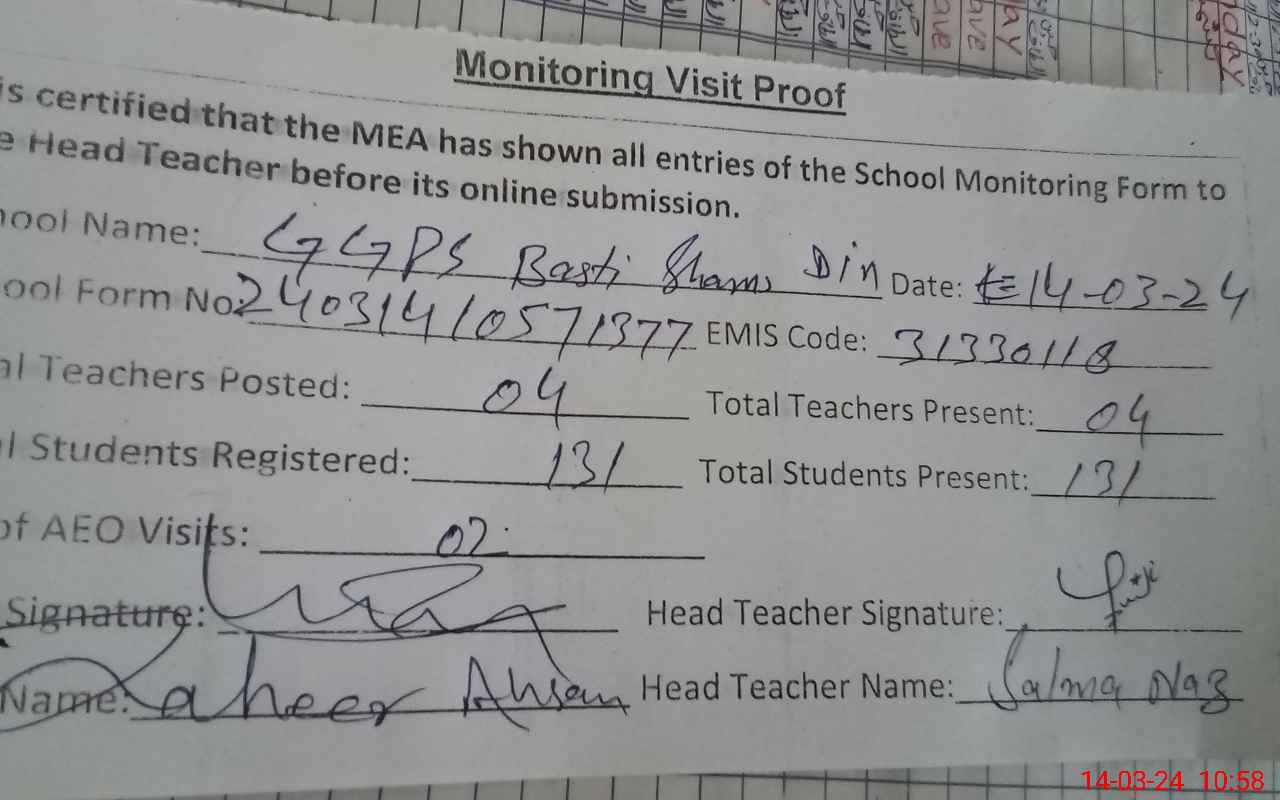 | Attendance Register | Head Teacher | MEA with School | Visit Proof |