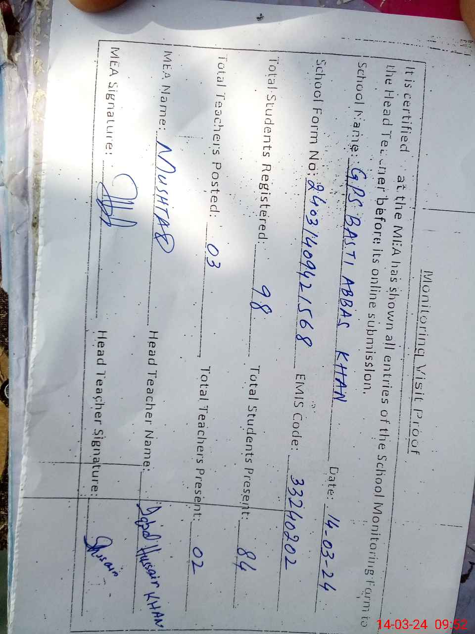 | EMIS Code: 33240202 | Name of School: GPS BASTI ABBASS KHAN | |||