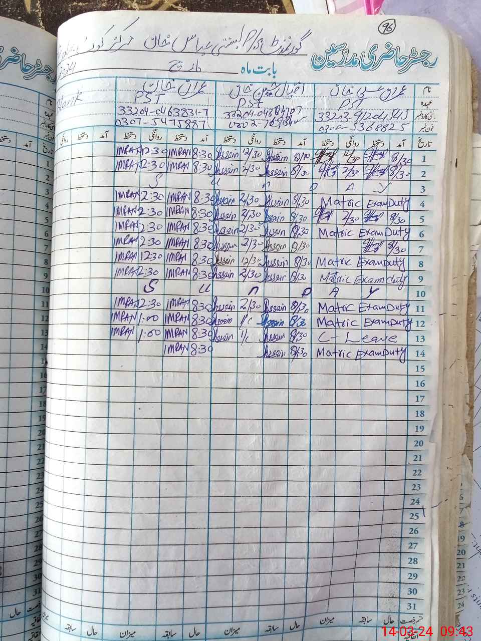 | Remarks (Use Separate Page if Required): Imran Ali khan PST found absent He is on duty since 04 March without prior permission of competent authority NBS bank statement not available and register not updated FTF register not available at the school | |||||