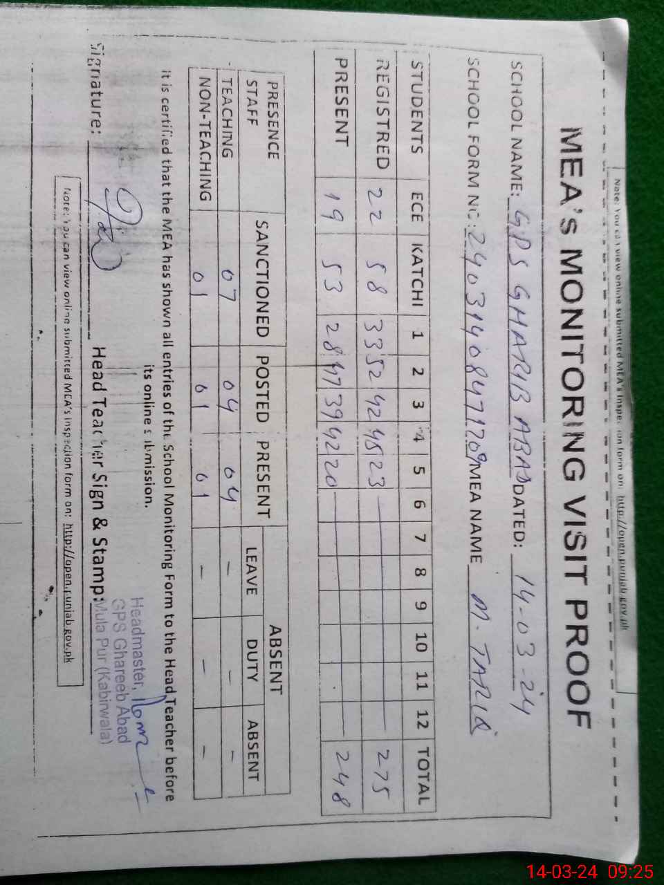 | EMIS Code: 36410524 | Name of School: GPS GHARIB ABAD MULA PUR KABIRWALA | |||
