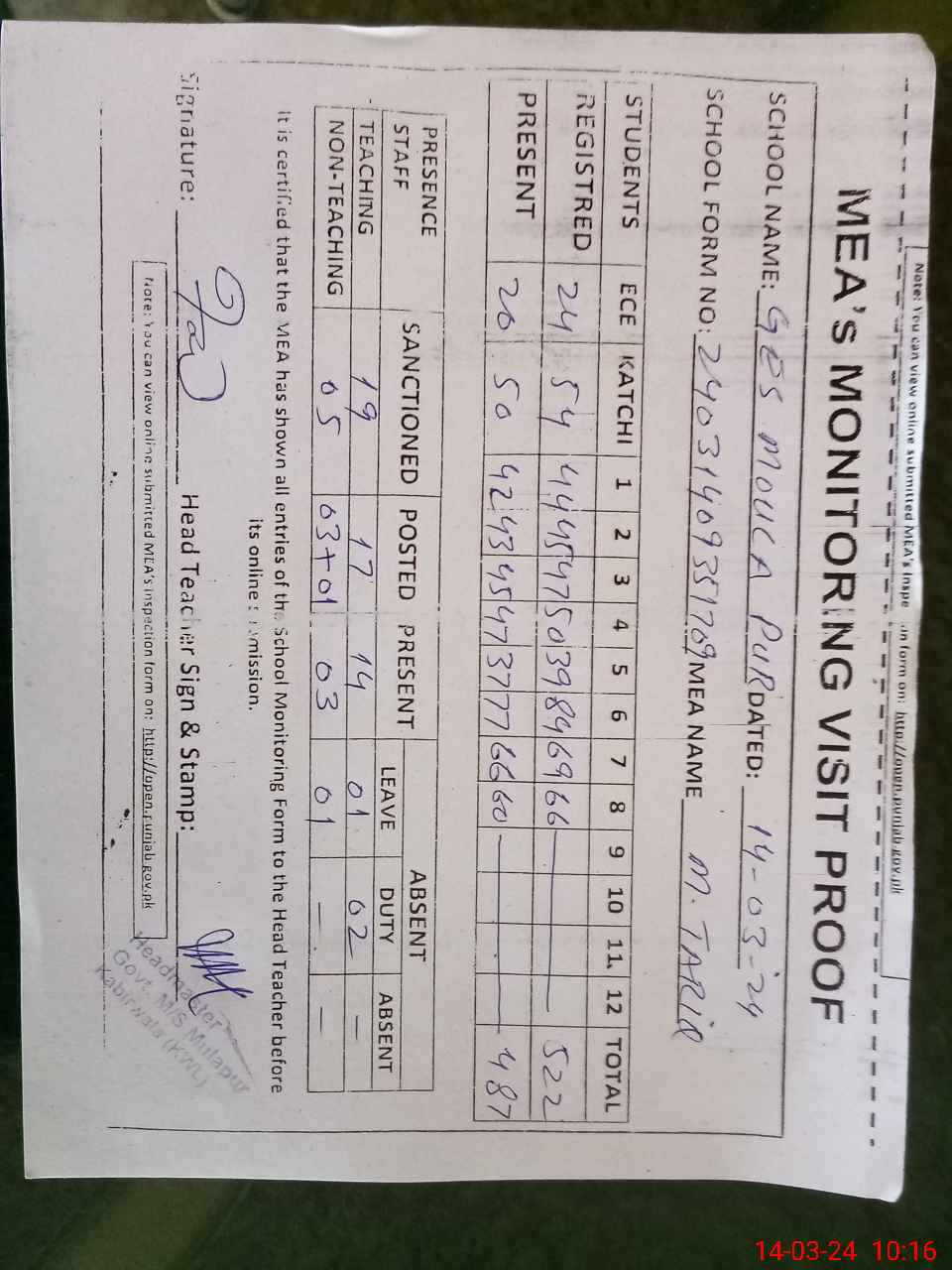 | EMIS Code: 36410046 | Name of School: GES MOULA PUR KABIRWALA | |||