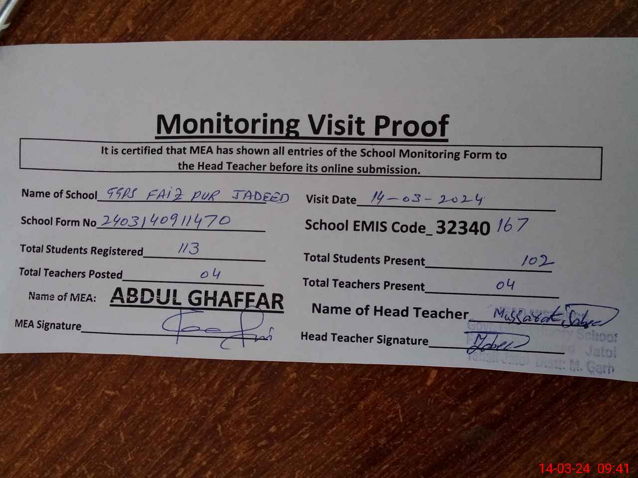 | EMIS Code: 32340167 | Name of School: GGPS FAIZ PUR JADEED | |||