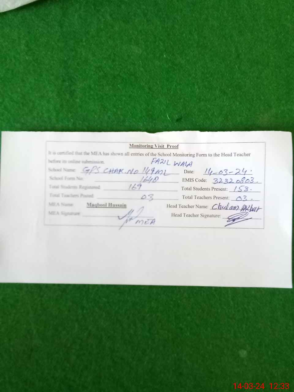 | EMIS Code: 32320803 | Name of School: GPS CHAK NO. 149/ML (FAZIL WALA) | |||