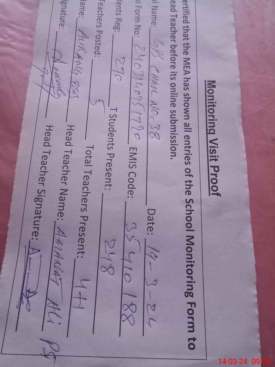 | EMIS Code: 35410188 | Name of School: GPS CHAK NO. 38 FEROZWALA | |||