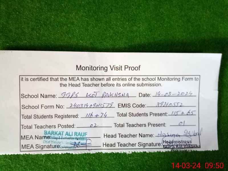 | EMIS Code: 39210552 | Name of School: GGPS KOT BAKHSHA | |||
