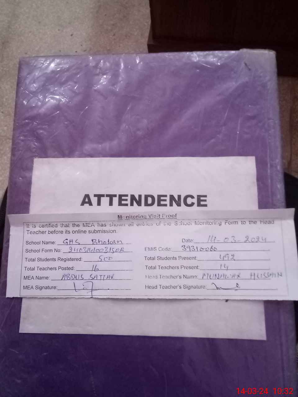 | Attendance Register | Head Teacher | MEA with School | Visit Proof |